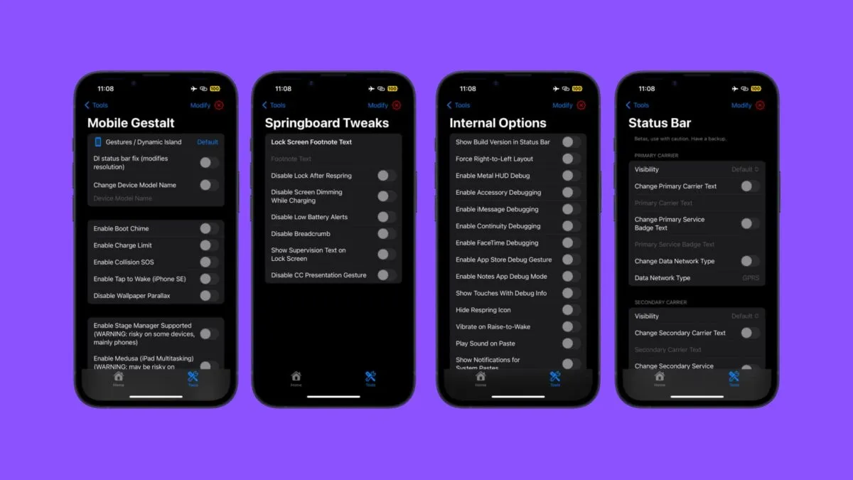 • ⚠️ 风险警告: 虽然工具相对安全,但修改系统文件(如 MobileGestalt)仍有极小概率导致白苹果或功能异常。建议操作前备份重要数据!