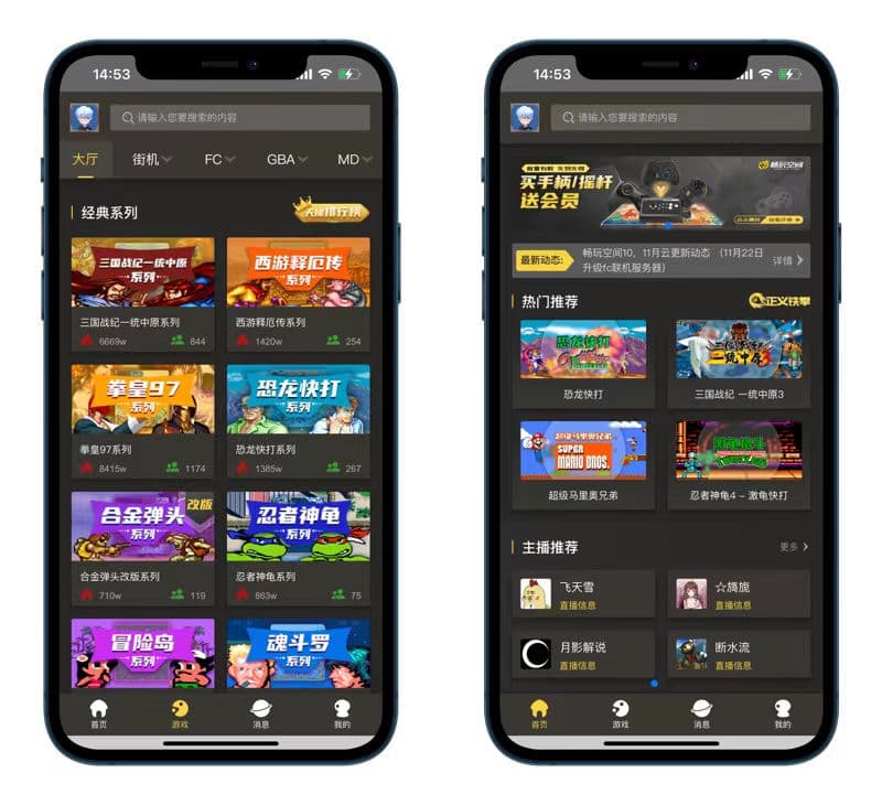 街机、FC、GBA、MD、DC、NAOMI、ATOM、PSP、PS2、PS、NDS等数千款经典游戏,无需下载游戏rom,即点即玩。云端记录存档、 键位等配置信息, 更换手机或电脑依旧保持实时同步体验。 在这里可以体验到领先的